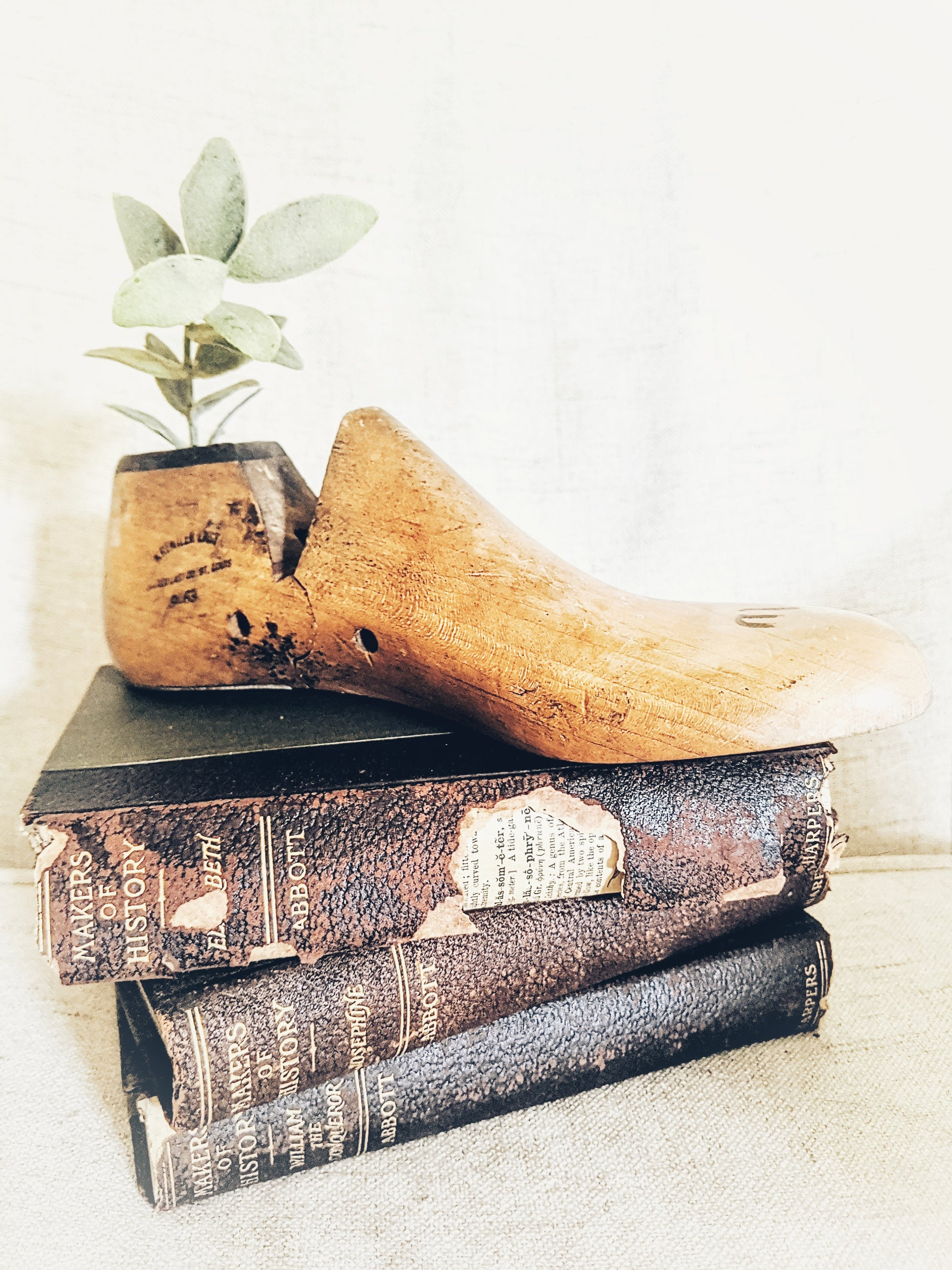 A charming conversation piece, this antique shoe last has a handsome aged tone and unique time-worn markings. Once used by shoemakers and cordwainers (a tradesperson who fashions shoes from leather), such forms were utilitarian in nature. Perch it on top of a set of books or style this wooden curiosity within a vintage vignette for a refined and artistic nod to the past. (Stamped numbers and wood grain will vary).